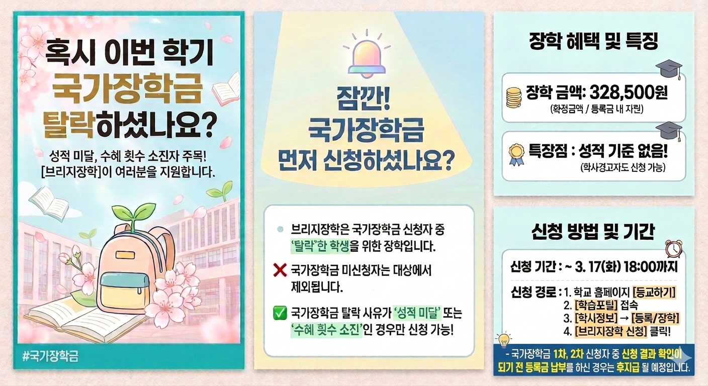 2026학년도 1학기부터 브리지 장학은 국가장학금을 신청하였으나, 안타깝게 성적 미달 또는 수혜 횟수 소진으로 '탈락'한 학생을 실질적으로 지원하기 위해 신설되었습니다.