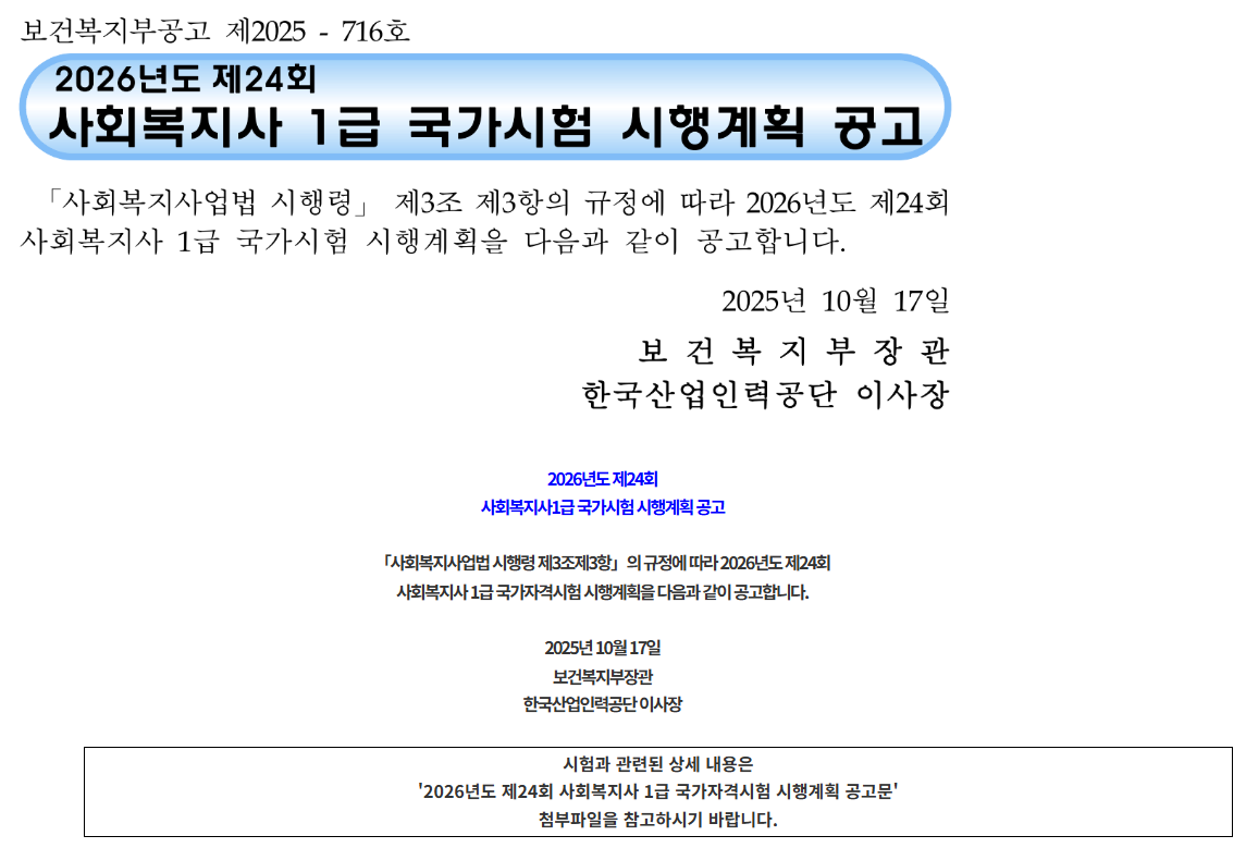 한국사회복지사협회에서 「사회복지사업법 시행령」 제3조 제3항의 규정에 따라 2026년도 제24회 사회복지사 1급 국가시험 시행계획을 다음과 같이 공고합니다. 시험과 관련된 상세 내용은 아래 링크 및 첨부파일을 참고하시기 바랍니다.