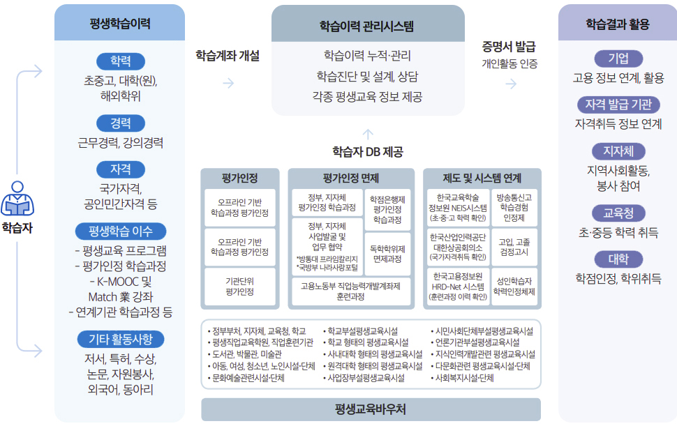 「평생교육법」제23조에 따라 국민의 다양한 학습경험을 온라인 학습계좌에 누적·관리하고, 이를 학력·자격인정과 연계하거나 고용정보로 활용함으로써, 학습이수 결과에 대한 사회적 인정 및 활용 기반을 확대하기 위한 제도입니다.