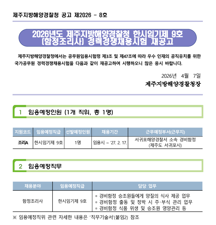 2026년도 제주지방해양경찰청 함정조리사(한시임기제 9호) 채용 재공고