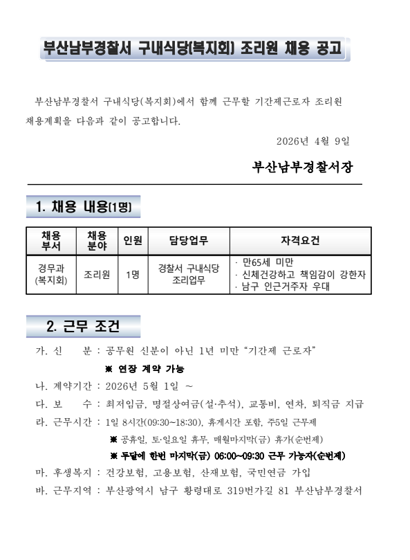 부산남부경찰서 구내식당(복지회) 조리원 채용 공고