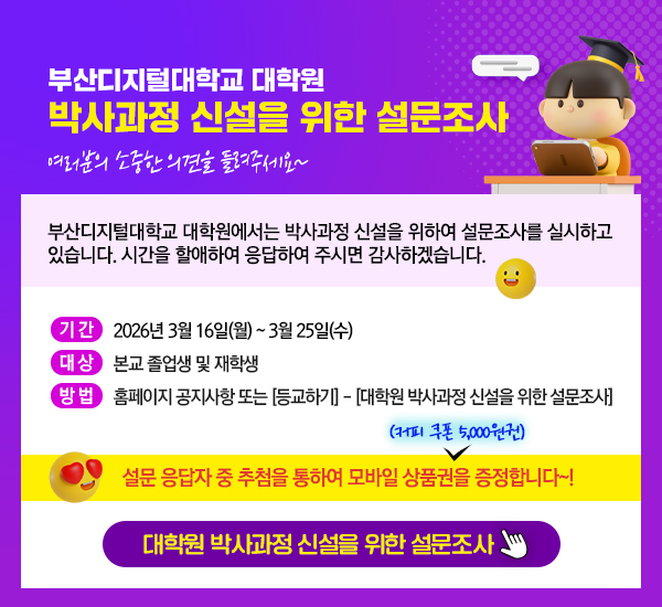 또는 LMS로그인 [ 부산디지털대학교 대학원 박사과정 신설 준비를 위한 설문 조사 ] 배너 클릭
