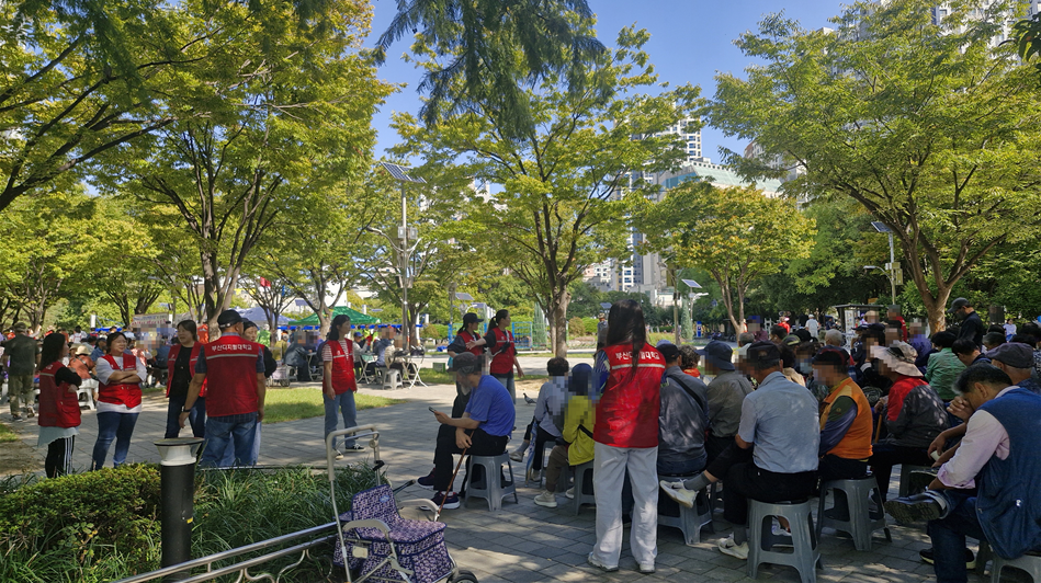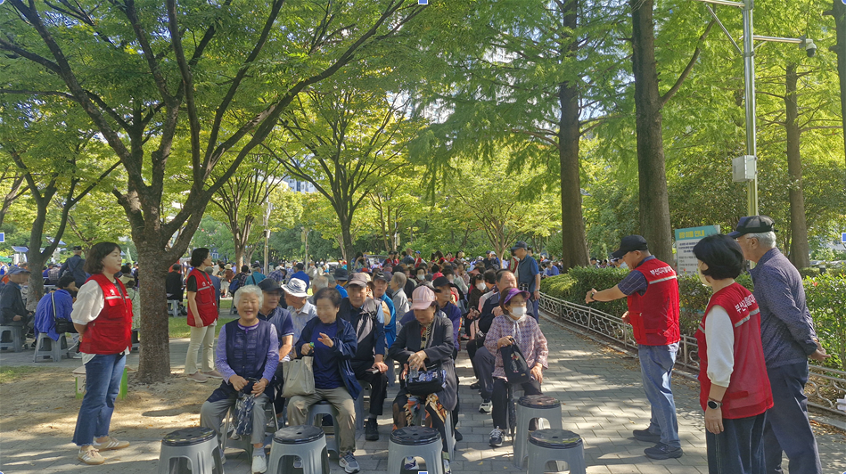 밝은 미소로 어르신들의 질서를 유지하고 자리를 안내하는 봉사자들의 모습은